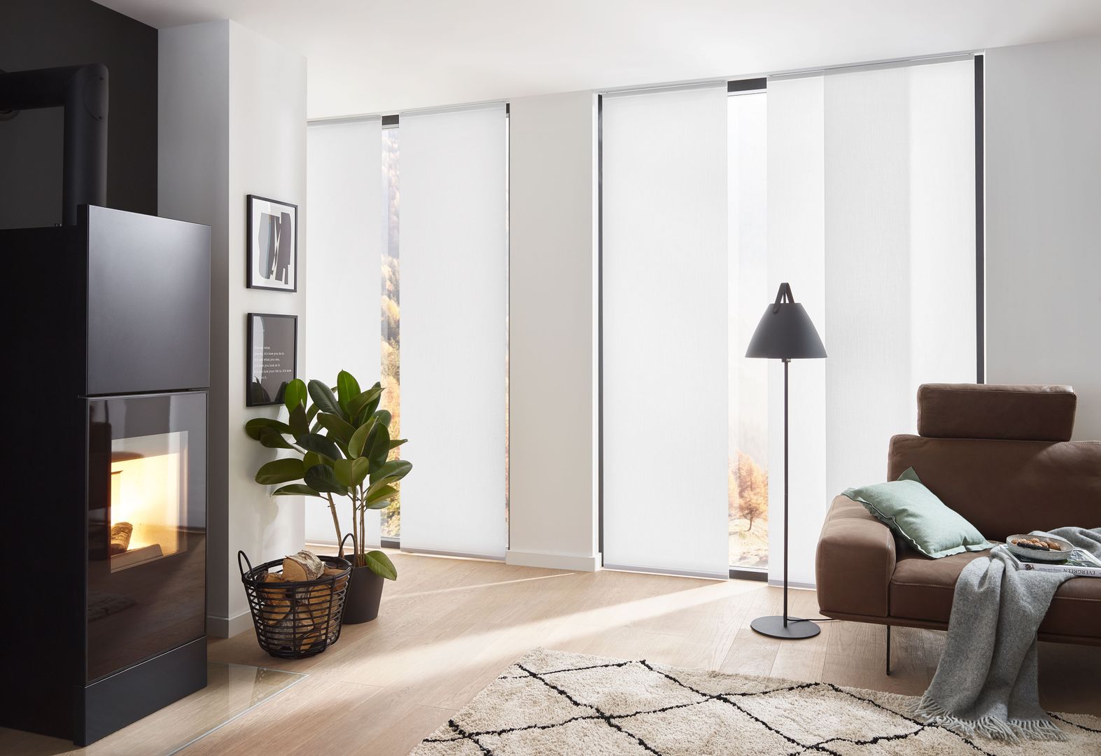 Die Paneele sind in individuellen Größen und praktisch unendlich vielen verschiedenen Stoffdesigns erhältlich. Die Paneele lassen sich einfach abnehmen und austauschen (Befestigung mittels Klettband). Die Montage der Schiebevorhänge erfolgt wahlweise an Wand oder Decke. Besonders für große Fenster, Glasfronten oder als Raumteiler bestechen Flächenvorhänge mit ihrer modernen, reduzierten Formensprache.