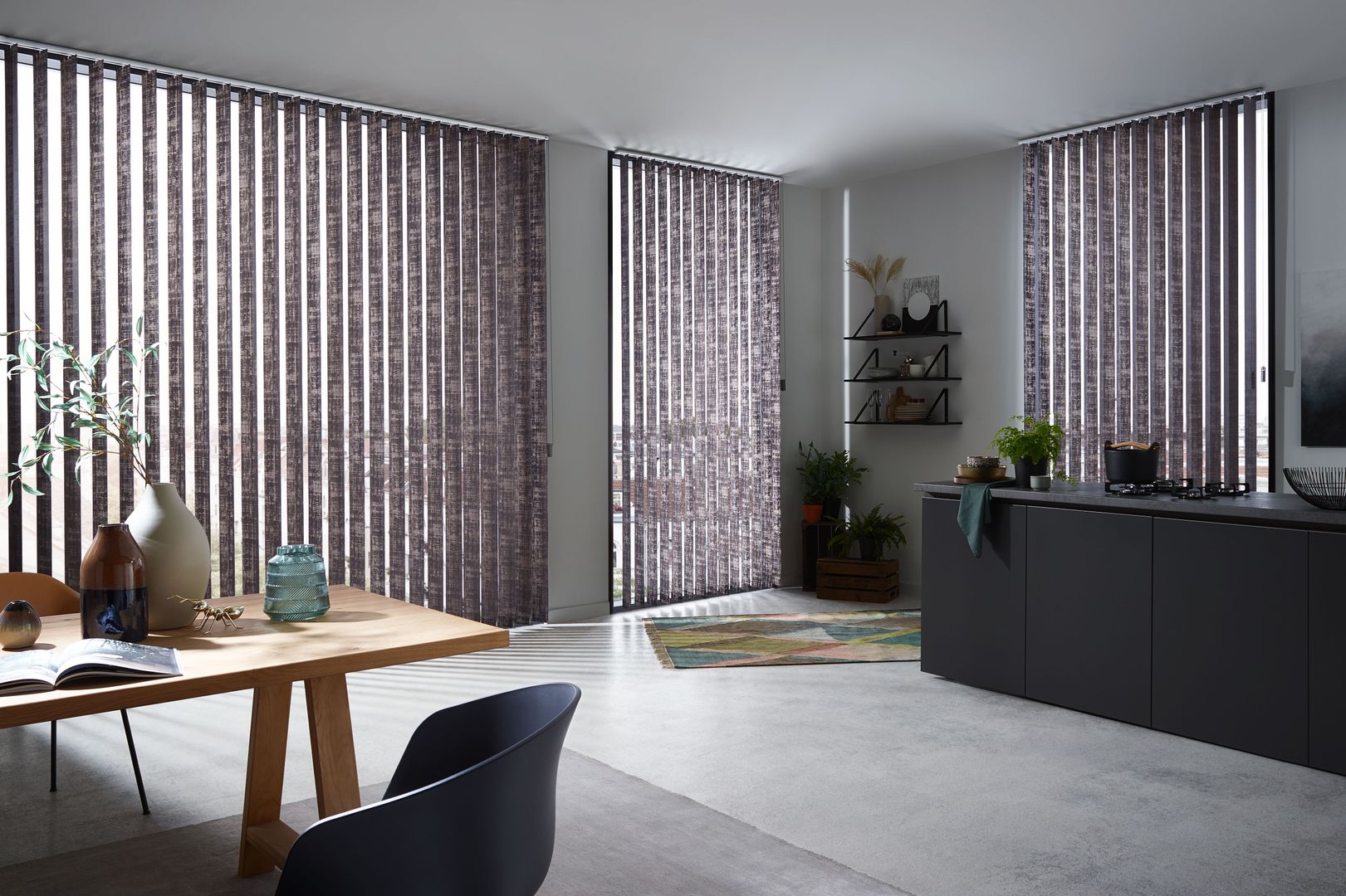 Wie wirkt ein Raum höher? Indem man das Vertikale betont. Diesem einfachen Gesetz folgt die Vertikaljalousie und schafft durch ihre großzügigen Lamellen ein Gefühl von Höhe, Freiheit und Luftigkeit. Sehr reduziertes Design und eine minimalistische Formensprache schaffen ein puristisches Ambiente, das Raum für Funktionalität lässt. Deshalb sind Lamellenvorhänge vor allem im Objektbereich und in der modernen Architektur sehr beliebt. Funktional sorgen sie für maximalen Sonnen- und Hitzeschutz, wobei durch die je nach Sonneneinstrahlung breiteren oder schmäleren Sichtschlitze - je nach Regulierung der Lamellen - für den nötigen Durchblick nach außen gesorgt und umgekehrt die Privatsphäre gesichert ist. Das Streulicht sorgt für ein angenehmes Lichtklima.